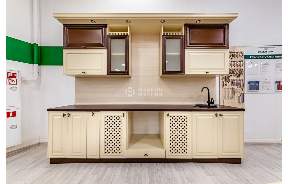 Вместительная Кухня Валерия (слоновая кость + коричневая эмаль) из сосны или берёзы имеет множество отделений для хранения кухонных принадлежностей. Она включает в себя изящные шкафчики, аккуратные ящики и полки. Вы сможете купить комплект по лучшей цене.| Материал | сосна |